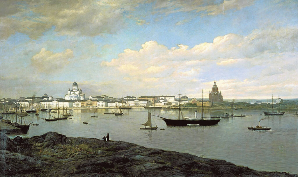 Helsinki’s maritime facade has perhaps been most poignantly immortalized by Oscar Kleineh in his enormous painting from 1877: the white neoclassical city shimmers in the sunlight, and on the barren Katajanokka headland, shadowed by clouds, stands the red-brick Uspenski Cathedral, the “Russian Church”.