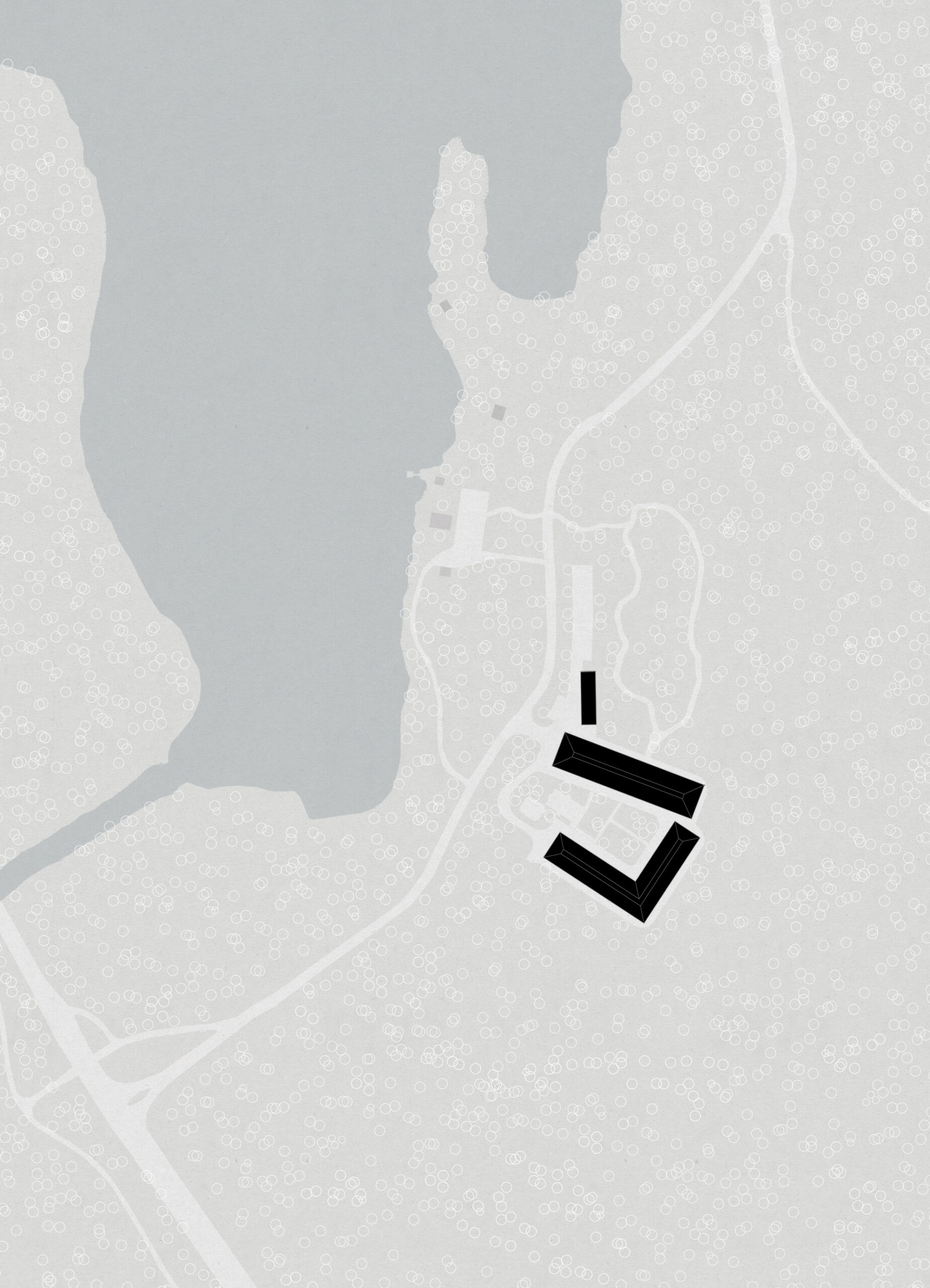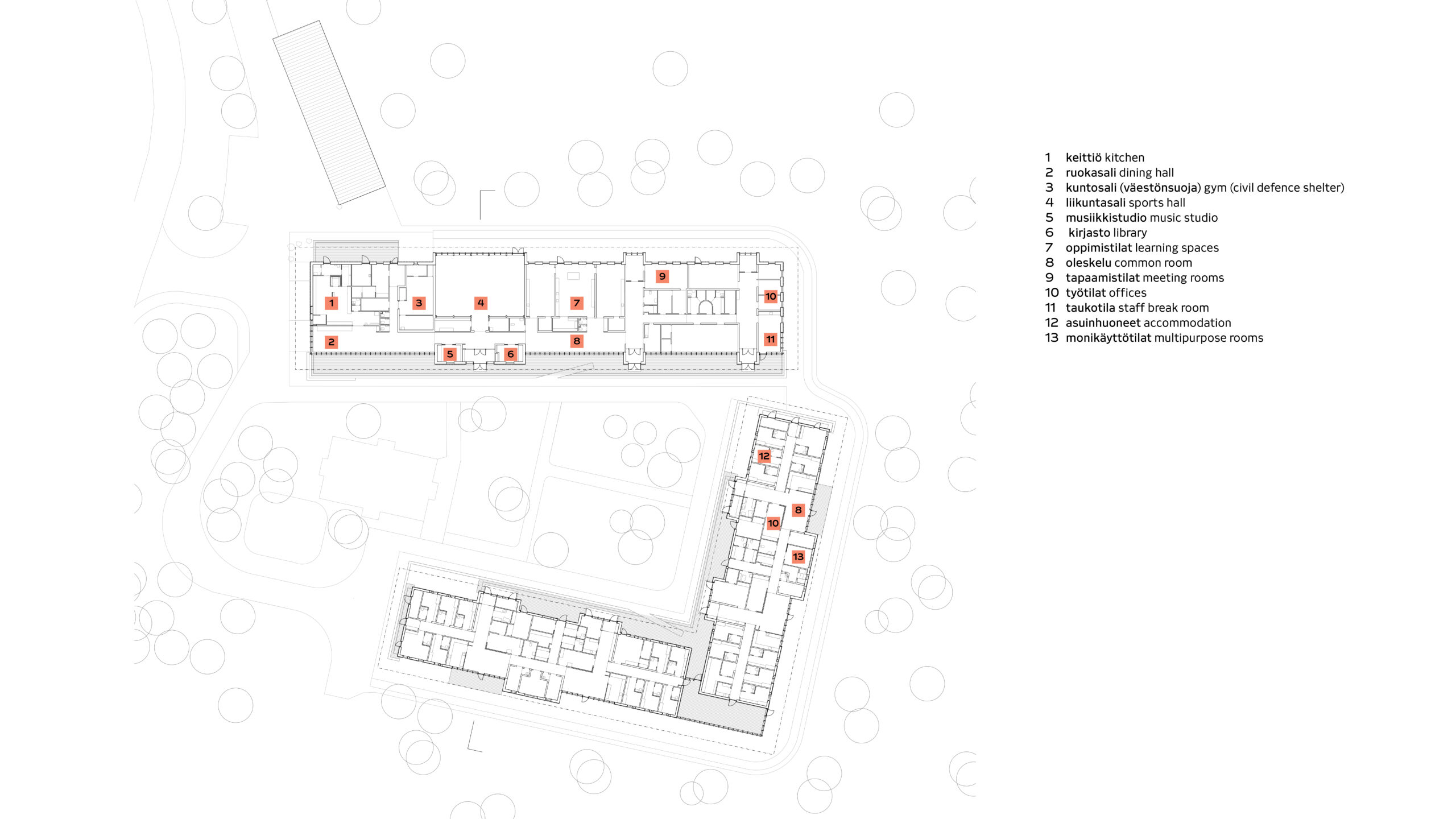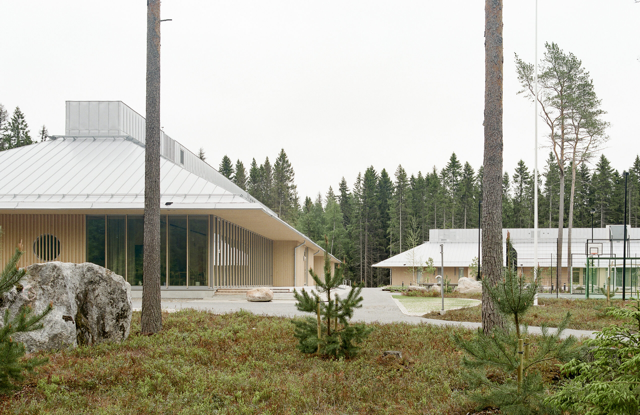 Koulukoti muodostuu julkisesta siivestä ja L-kirjaimen muotoon asettuvista neljästä asumisyksiköstä.