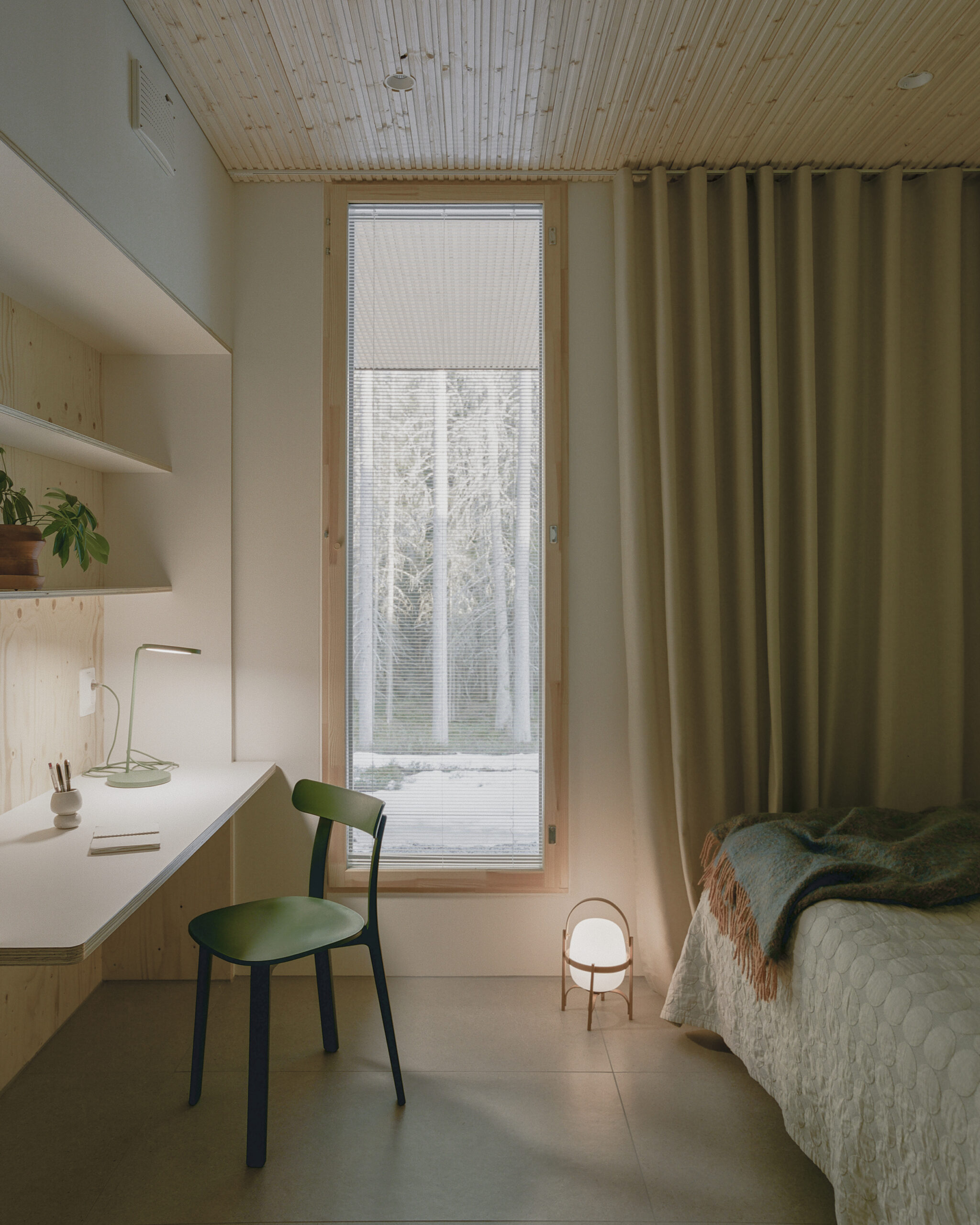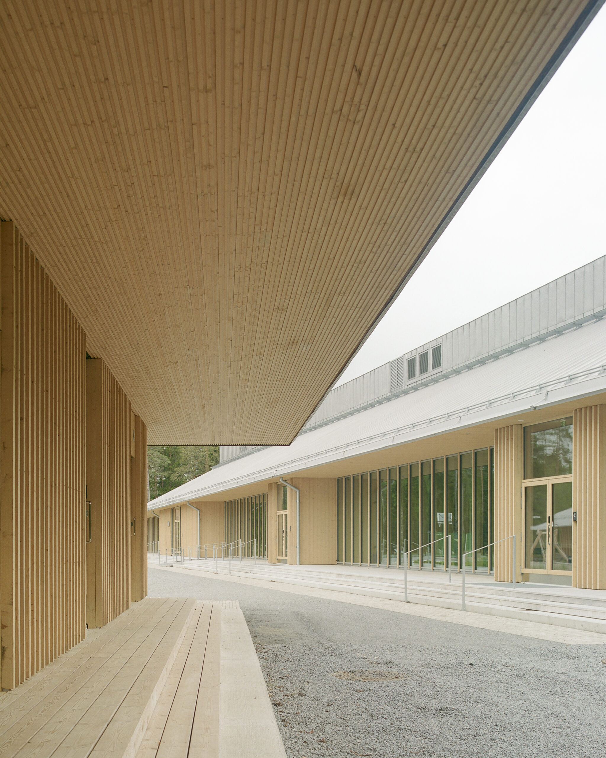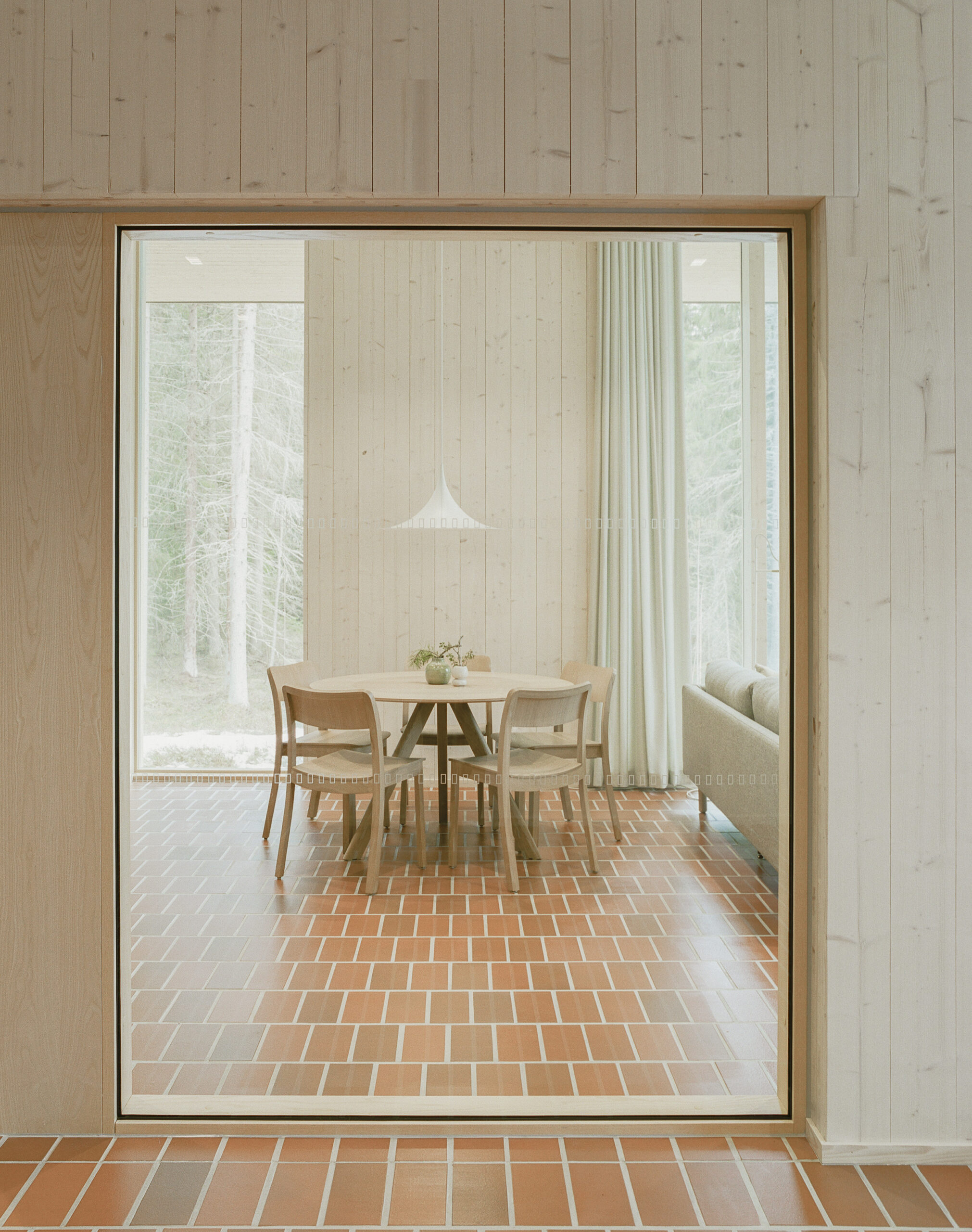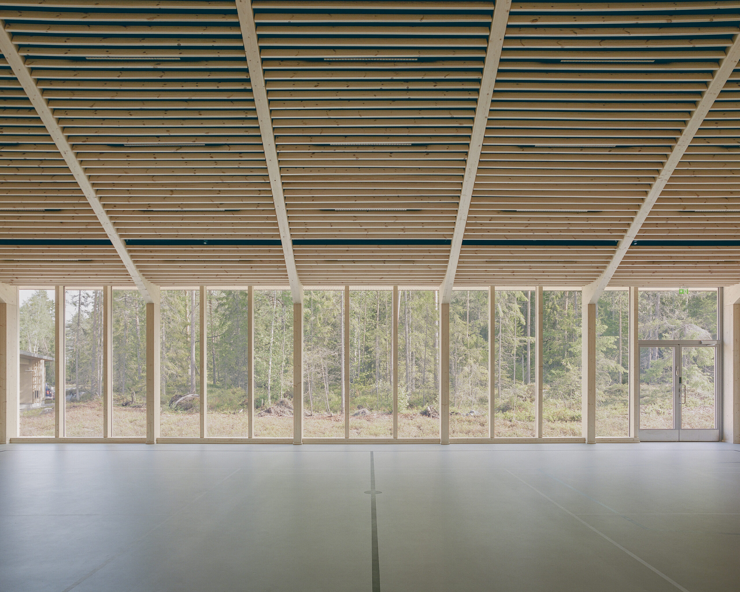 Puulasiseinät ovat osa kantavaa runkoa, mikä vähensi rakennusvaiheita ja mahdollisti rauhallisen ilmeen.