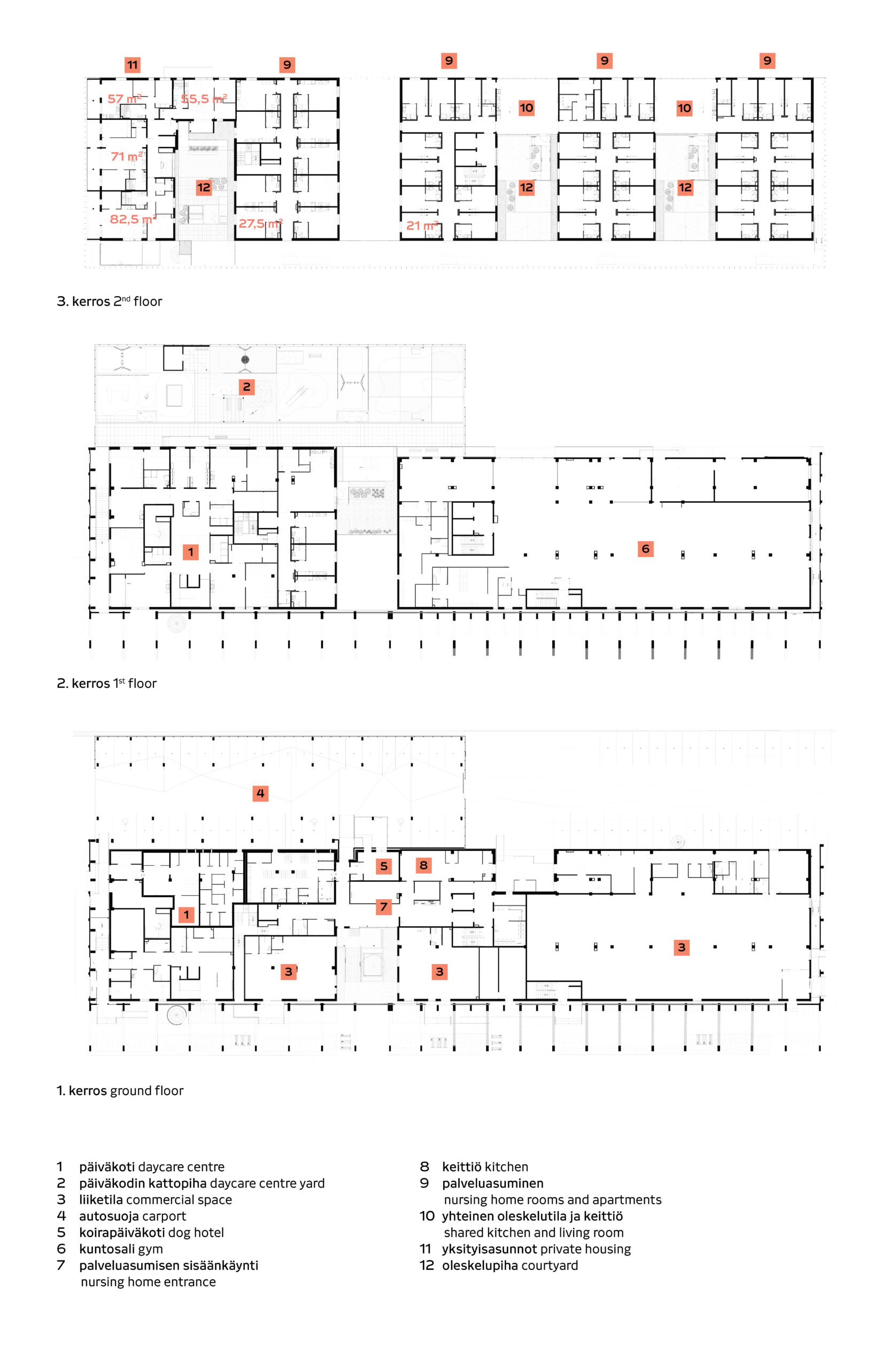 Rakennustyyppi hoiva- ja yksityisasuntoja, päiväkoti ja liiketiloja